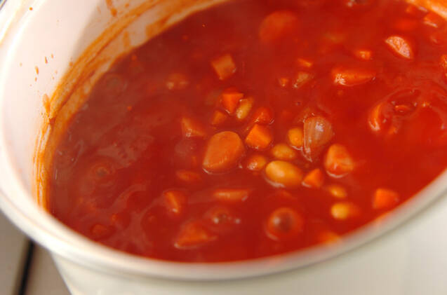 水煮大豆、トマトピューレ、顆粒スープの素を加え、弱めの中火で15分程煮る。