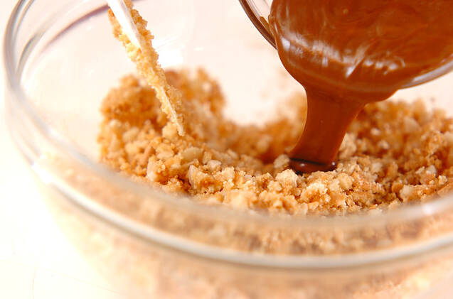 <クッキー生地>を作る。クッキーを抗菌の袋に入れ、麺棒で細かく砕き、ボウルに入れる。そこにアーモンドダイス、湯せんで溶かしたバター、プラリネマッセ大さじ4を加え混ぜる。