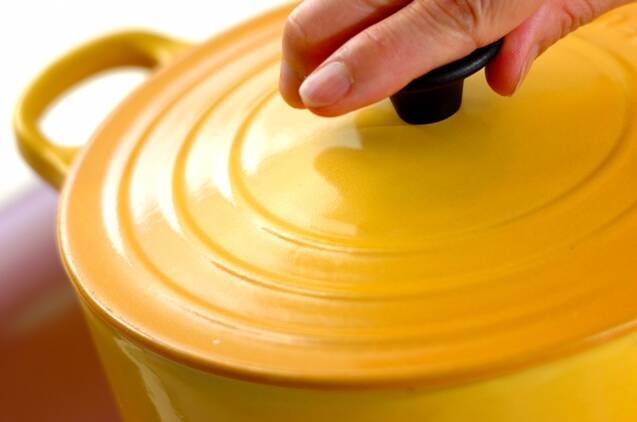 蓋をして中火にかける。沸騰したら10~12分加熱後、弱火で5~7分炊いて火を止める。