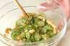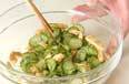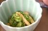 <ゴマ酢>の材料を混ぜ合わせ、キュウリ、油揚げを加えて和え、器に盛る。