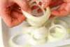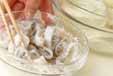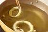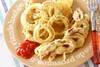 ボウルに玉ネギ、イカをそれぞれ入れ、塩コショウをして、小麦粉と片栗粉を少量加えよく混ぜ合わせる。全体にからまるくらいの量を加えてまぶす。