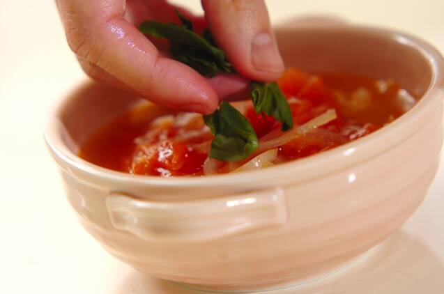 塩で味を調えて器によそい、ゴマ油をかけ、バジルをちぎって散らす。