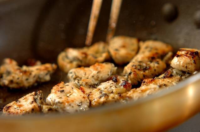 <鶏肉とズッキーニのベジパスタ>を作る。フライパンにオリーブ油を入れて加熱し、鶏むね肉を両面こんがりと焼き、いったん取り出す。ビニール袋に残っている汁気は残しておく。