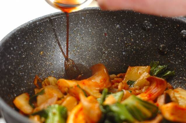 全体が炒められたら鍋肌にしょうゆを回しかけ、中華麺の上にのせる。
