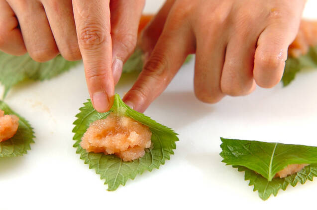 大葉にタラコをのせ、半分に折るようにしてタラコを包む。