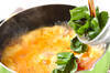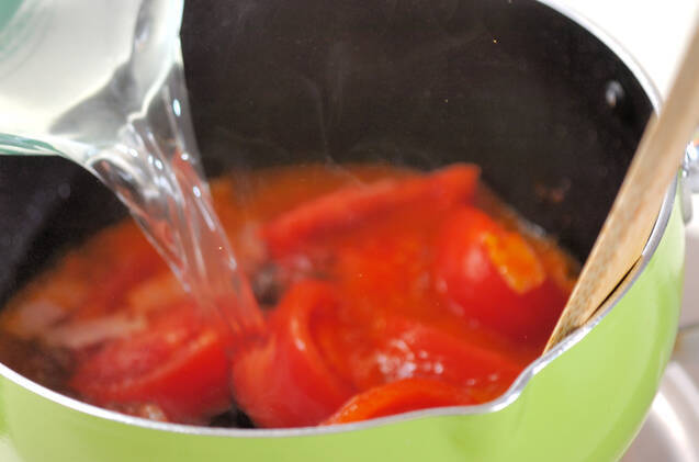鍋にサラダ油を強火で熱し、ベーコンを炒める。脂が出てきたらトマトを加えて炒め合わせ、トロッとしてきたら<チキンスープ>を加える。