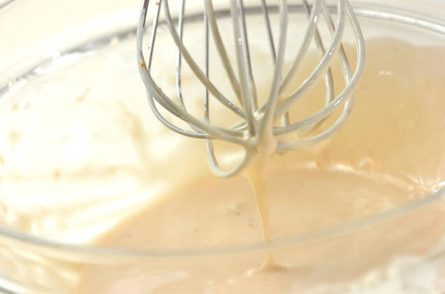 <溶き衣>の顆粒スープの素と水を混ぜ合わせる。ボウルに小麦粉、片栗粉、塩コショウを入れ、泡立て器で混ぜながら水と混ぜ合わせた顆粒スープの素を加え、泡立て器を持ち上げると、トロンと衣が落ちる位の柔らかさに混ぜ合わせる。
