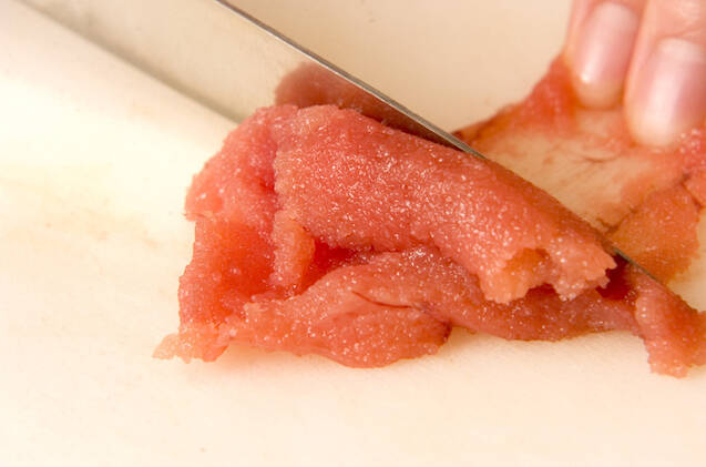 ジャガイモはきれいに水洗いし、濡れたままラップをかけて電子レンジに入れ、6~7分加熱する。竹串がスッと刺されば皮をむき、1cmの厚さに切る。タラコは薄皮に切り込みを入れ、中身を取り出す。