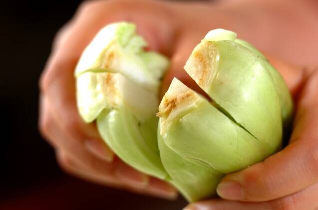 チンゲンサイはきれいに水洗いし、根元に十字の切り込みを入れ手で4つに裂く。大きい場合は6つに裂いて下さい。