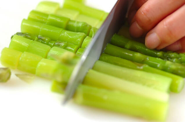 分量外の塩少々を入れた熱湯で、グリーンアスパラを3~4分ゆで、冷水に取って粗熱を取り、幅1cmに切る。