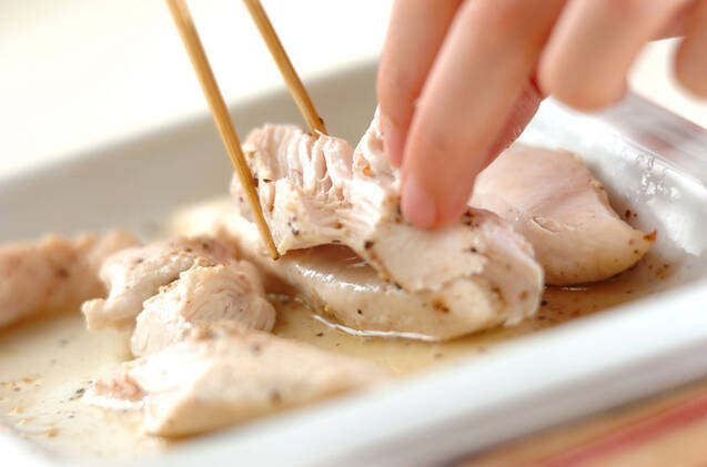 鶏ささ身は筋を引いて耐熱容器に並べ、酒を振る。塩コショウをしてふんわりラップをかけ、電子レンジで2~2分30秒加熱し、そのままおいて余熱で中まで火を通す。粗熱が取れたら細く裂く。電子レンジは600Wを使用しています。