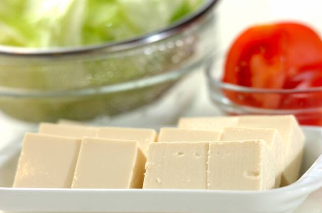 絹ごし豆腐は食べやすい大きさに切る。レタスは水に放ち、パリッとしたらザルに上げ、食べやすい大きさにちぎる。トマトはヘタをくり抜き、8つのくし切りにする。