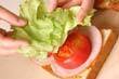 焼き上がったトースト1枚にハム2枚、トマト2切れ、レタスをのせて、トースト1枚をのせ、上から軽く押さえる。同様にもう1セット作る。食べやすい大きさに切り分け、<キャベツのスープ>とヨーグルトと一緒にプレートに盛り付ける。