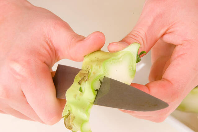 ブロッコリーは小房に分ける。軸は皮をむき、一口大の乱切りにする。