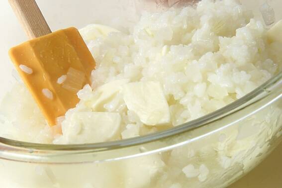 ゆでたお米が熱いうちにモッツアレラチーズを混ぜ合わせ、トロ~ッと溶けてくれば、器に盛り、塩コショウ、オリーブ油をかけ、イタリアンパセリを散らせる。