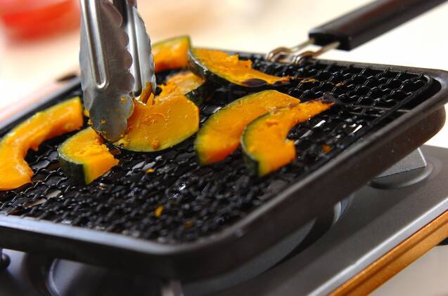 焼き網を熱し、カボチャ、レンコンを両面焼き色がつく位まで焼き、熱いうちに<マリネ液>につける。