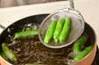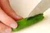 シシトウは軸の長さを揃えて切り、揚げた時にはじけないように切り込みを入れる。