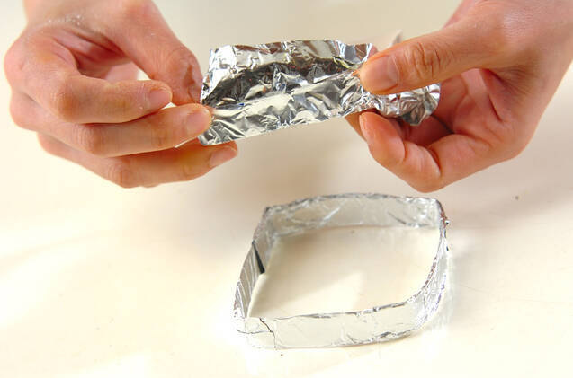 牛乳パックを幅1cmに切り、アルミホイルで巻いておく(4個用意しておく)。