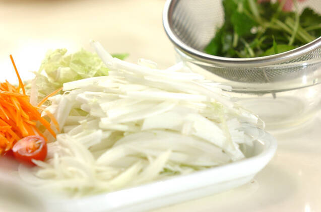 白菜は水洗いして縦半分に切り、長さ4~5cmに切って、軸は縦細切りに、葉の部分は横幅1cmに切る。