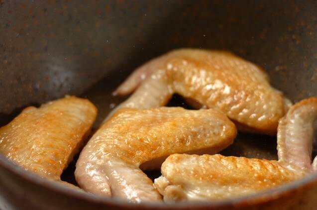 鍋にゴマ油を中火で熱し、鶏手羽先を皮目からこんがりと焼き色がつくまで焼く。