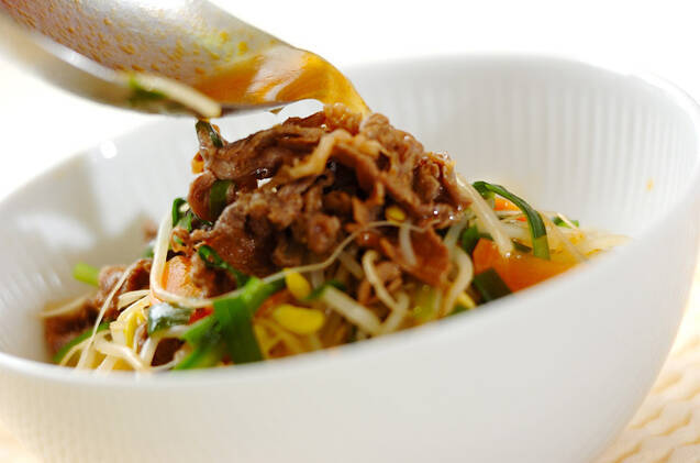 煮たったらアクを取ってニラ、豆モヤシを加える。再び煮たったら塩コショウで味を調え、春雨を盛った器に注ぐ。