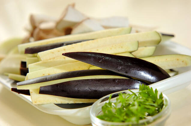 ナスはヘタを切り落として縦に棒状に切る。長い場合は長さを半分に切って下さい。