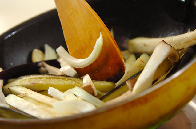 フライパンにオリーブ油、ニンニクを入れて中火にかけ、香りがたってきたらナス、エリンギ、玉ネギを加え、強火で炒め合わせる。
