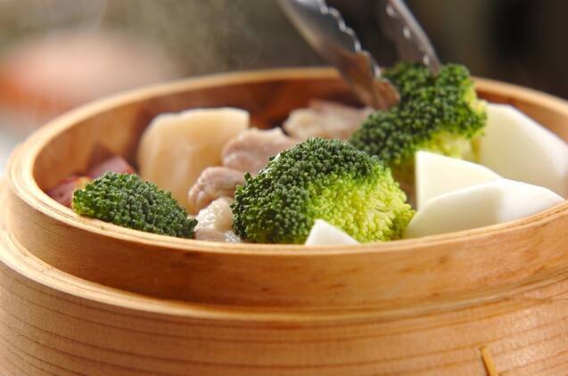 (2)のせいろにカブとブロッコリーを加え、2~3分蒸す。火が通ったらせいろを器にのせ、<みそダレ>の小皿を添える。