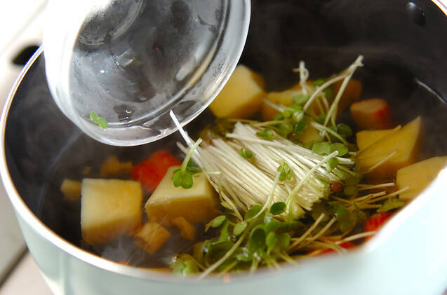 卵豆腐が温まったら火を止め、最後に貝われ菜を加え、器に注ぐ。