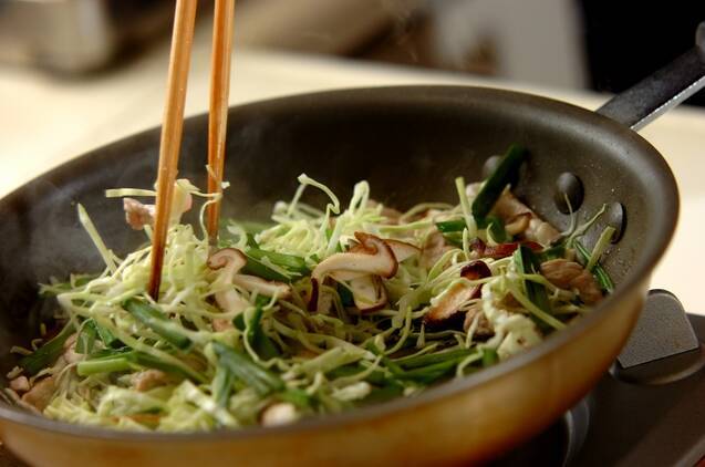 フライパンに分量外のゴマ油を中火で熱し、豚もも肉を炒め、色が変われば野菜をすべて加えてしんなりするまで炒める。