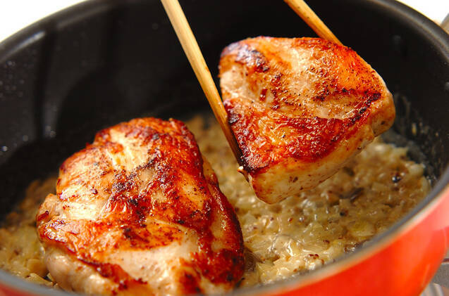 (3)の<ソース>を中火にかけ、(2)の鶏むね肉を戻し入れる。鶏むね肉が温まったら、食べやすい大きさに切って盛り合わせ、<ソース>をかける。