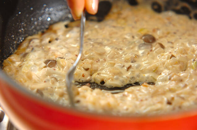(2)のフライパンをサッと拭いて残りのバターを足し、玉ネギ、シメジを加えてしんなりするまで炒め合わせる。<ソース>の材料を加え、少しトロミがつくまで煮詰め、塩コショウで味を調える。