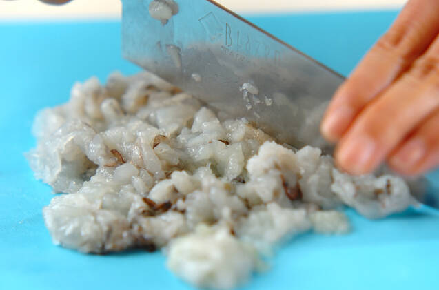 <エビ団子>のエビは殻をむき、厚みを半分に切って背ワタを取り、分量外の塩をもみ込み、さらに片栗粉をもみ込んで水で洗い、水気を拭き取る。包丁で叩き、その他の<エビ団子>の材料と混ぜ合わせる。