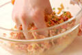 <種>の豚バラ薄切り肉は細かく刻む。むきエビは塩水で洗い細かく刻み豚肉と合わせ、刻みネギと<下味>を加え手でよく混ぜ合わせる。