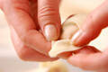 更に下の両端の片側に水をつけ、反対側を曲げて合わせ、しっかりと押さえてくっつける。