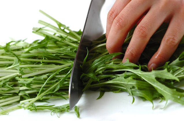 水菜はきれいに水洗いして、根元を少し切り落とし、長さ4~5cmに切る。