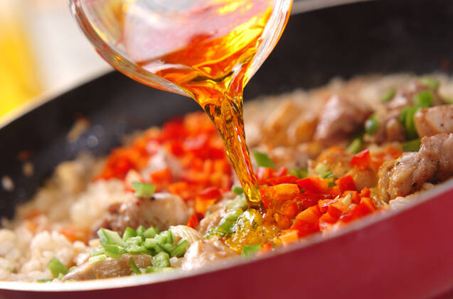 お米が透き通ってきたら、白ワインを加えて炒め合わせ、(1)の鶏肉を戻し、ピーマン、赤ピーマンをのせ、サフラン水と水を加える。