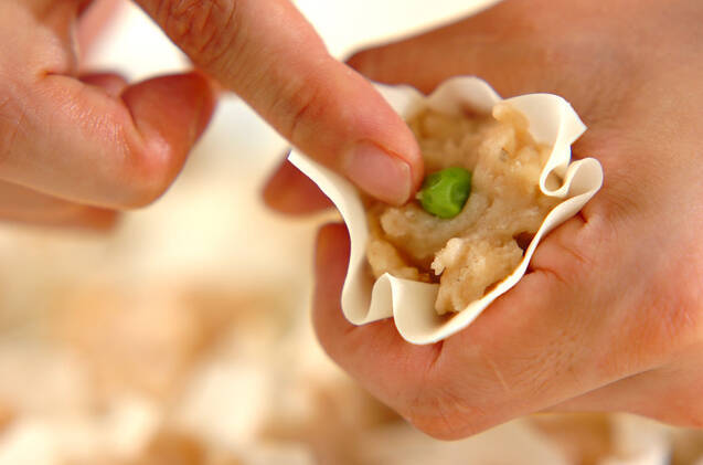 手にシューマイの皮を1枚置き、大さじ1くらいの(1)の<タネ>をヘラでのせ、握って形を整え、グリンピースを1粒のせる。