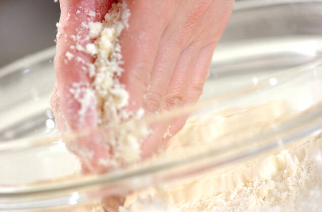 冷凍していた無塩発酵バターを(1)に入れ、カードで手早く細かくなるまでカットする。両手で生地全体をすり混ぜ、まとめる。20分ほど冷蔵庫で休ませる。