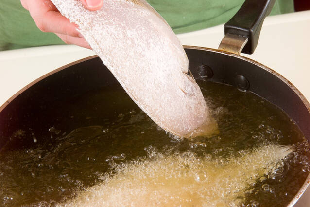 170℃の揚げ油にカレイを入れ、ゆっくり色よくカリッと揚げる。