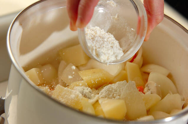 鍋にバターを中火で溶かし、ジャガイモ、玉ネギ、ニンジン、マッシュルームを強めの中火で炒める。玉ネギがしんなりしたら、小麦粉を加えてさらに炒め合わせる。