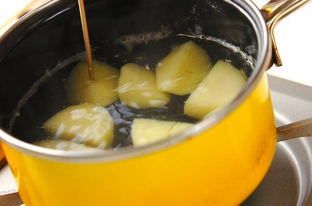 鍋に新ジャガイモとかぶる位の水を加え、強火にかける。煮たったら新ジャガイモが柔らかくなるまで中火でゆでる。