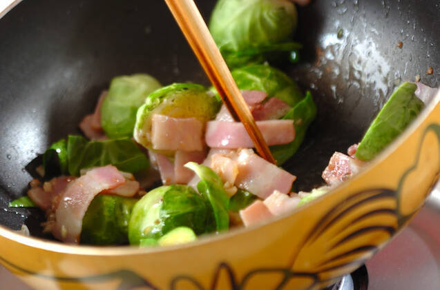 フライパンにオリーブ油とニンニク、アンチョビを入れて中火にかけ、香りがたってきたら、ベーコン、芽キャベツを炒めて器に盛る。