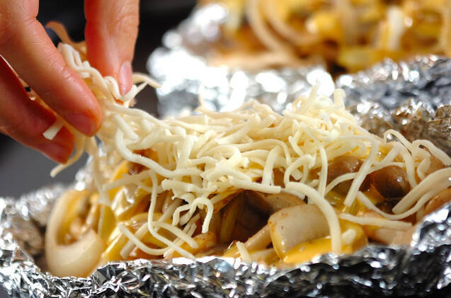 <ソース>、ピザ用チーズを順にかけ、250℃に予熱しておいたオーブンで表面に少し焼き色が付くまで8~10分焼き、ドライパセリを振る。