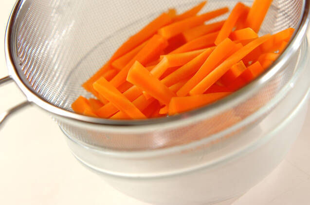 たっぷりの熱湯にニンジンを加え、1~2分ゆでてザルに上げる。