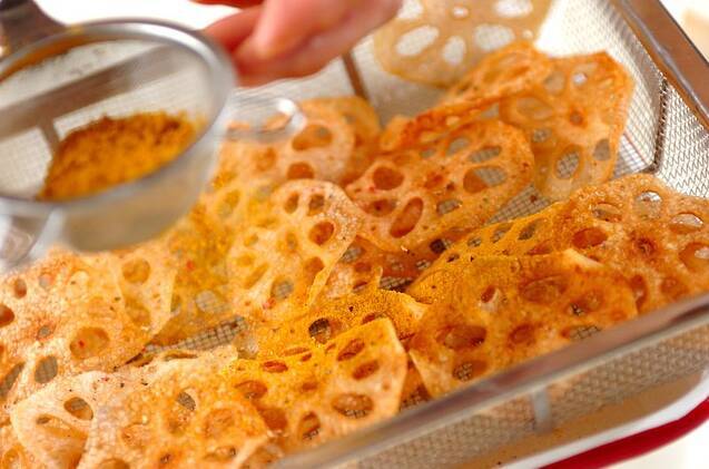 170℃の揚げ油にレンコンを入れてパリッと揚げ、油をきって塩コショウとカレー粉を振り、器に盛り分ける。