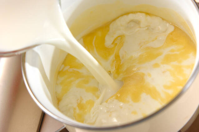 <ホワイトソース>を作る。鍋にバターを焦がさない様に弱火で溶かし、小麦粉を加えて木ベラで混ぜながら、泡が細かくなるまで、焦がさない様に炒める。プクプク泡立ってきたら冷たい牛乳を一気に加えて中火にし、泡立て器でダマにならない様に手早く混ぜ合わせる。塩コショウしてトロリとするまでときどき混ぜながら、とろみがついてきたら弱火にして少し煮詰める。