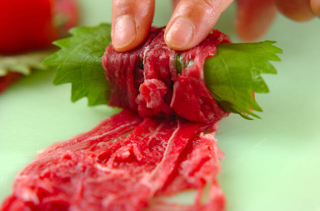 牛肉を縦長になるようにまな板に広げ、大葉、トマトを1つずつのせ、手前からしっかり巻く(6個作る)。巻き終わったら、小麦粉を薄くまぶしつける。