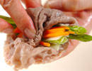 <からし酢みそ>、<マヨソース>の材料をそれぞれ混ぜ合わせ、ポン酢しょうゆもそれぞれの容器に入れる。器にゆでた牛肉、野菜とゴマの葉、ミョウガ、細ネギ、チコリを盛り合わせ、マイクロトマトを飾る。牛肉でお好みの野菜とともに巻いて、お好みのタレをつけて召し上がれ。