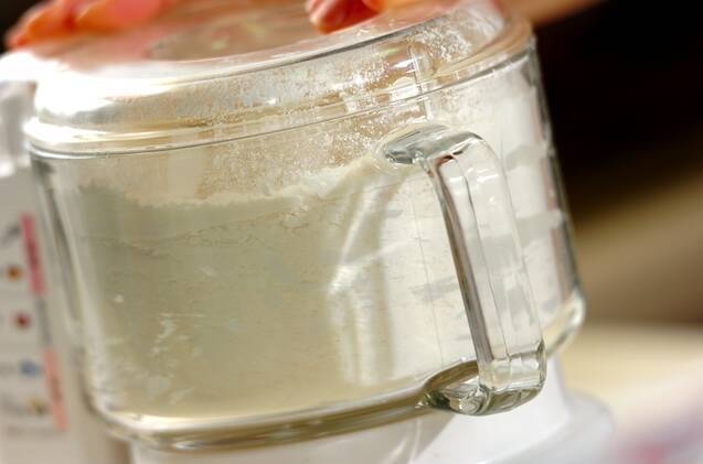 <タルト生地>を作る。フードプロセッサーに薄力粉と砂糖を入れ軽く混ぜたら、冷やしたバターを加え粉状になるまでかくはんする。